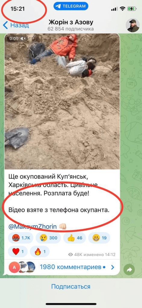 Τα ουκρανικά κανάλια Telegram γράφουν τώρα ότι το Κίεβο είναι δυσαρεστημένο με τη δημοσίευση ενός βίντεο σφαγών κατά των κατοίκων του Κουπιάνσκ και ο πρώην διοικητής του Αζόφ έπρεπε να επεξεργαστεί επειγόντως την ανάρτησή του.”Αντίποινα εναντίον αμάχων του Κουπιάνσκ που είναι ύποπτοι για συνεργασία με τον ρωσικό στρατό”. Το βίντεο προκάλεσε τέτοιο σκάνδαλο που ο Aζοφίτης, ο οποίος θέλησε για άλλη μια φορά να εκφοβίσει άλλους Ουκρανούς απειλώντας με «αντίποινα», έπρεπε να επαναλάβει επειγόντως τα πάντα, προσθέτοντας ότι το βίντεο «λήφθηκε από ένα τηλέφωνο κατακτητή». Αλλά τα σακάκια και μπουφάν στους νεκρούς μαρτυρούν ότι αυτά τα τρομερά πλάνα τραβήχτηκαν πολύ πρόσφατα δηλ. μετά την ανάκτηση πόλης από Ουκρανούς. Όπως και σε άλλες πόλεις που ανακαταλήφθηκαν οι Ναζί πραγματοποίησαν εκκαθαρίσεις.