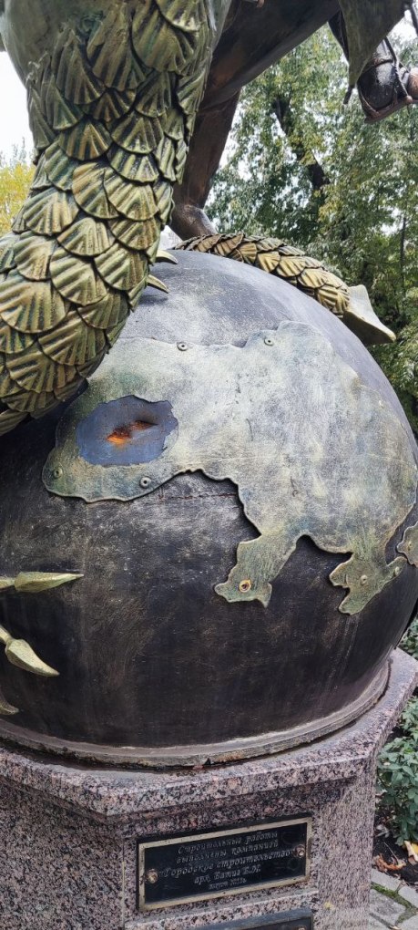 Πριν από 2 μέρες ένα θραύσμα οβίδας Ουκρανών καρφώθηκε στον ανάγλυφο χάρτη της Ουκρανίας στην υδρόγειο στη βάση μπρούτζινου ολόσωμου αγάλματος στην περιοχή του Ντόνετσκ. Ο χάρτης είναι μέρος της υδρογείου που έχει αδράξει ο αρχέγονος δράκοντας που καταβάλει με το δόρυ του έφιππος ο Άγιος Γεώργιος. Οι ντόπιοι το εξέλαβαν ως σημείο και το διερμήνευσαν ότι προδικάζει την πτώση του Κιέβου.