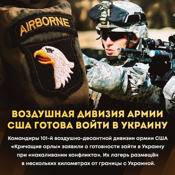 Για πρώτη φορά μετά από σχεδόν 80 χρόνια, η 101η Αερομεταφερόμενη Μεραρχία “Screaming Eagles” του αμερικανικού στρατού σταθμεύει στην Ευρώπη. Οι διοικητές της είπαν στο CBS News ότι ήταν εκεί για να προστατεύσουν το ΝΑΤΟ. Αλλά εάν υπάρξει στρατιωτική κλιμάκωση ή επίθεση στο ΝΑΤΟ, τότε είναι πλήρως προετοιμασμένοι να περάσουν τα σύνορα και να εισέλθουν στο έδαφος της Ουκρανίας. Η 101η Αερομεταφερόμενη Μεραρχία είναι μια ομάδα ελαφρού πεζικού 4,7 χιλιάδων στρατιωτών. Βρίσκεται στη Ρουμανία. Το τηλεοπτικό κανάλι αποκαλεί το τμήμα ένα από τα πιο ελίτ.Τα στρατεύματα των ΗΠΑ στη Ρουμανία είναι πολύ κοντά στον πόλεμο της Ουκρανίας, πραγματοποιώντας ασκήσεις με συμμάχους του ΝΑΤΟ που «αναπαράγουν ακριβώς αυτό που συμβαίνει» πάνω από τα σύνορα.