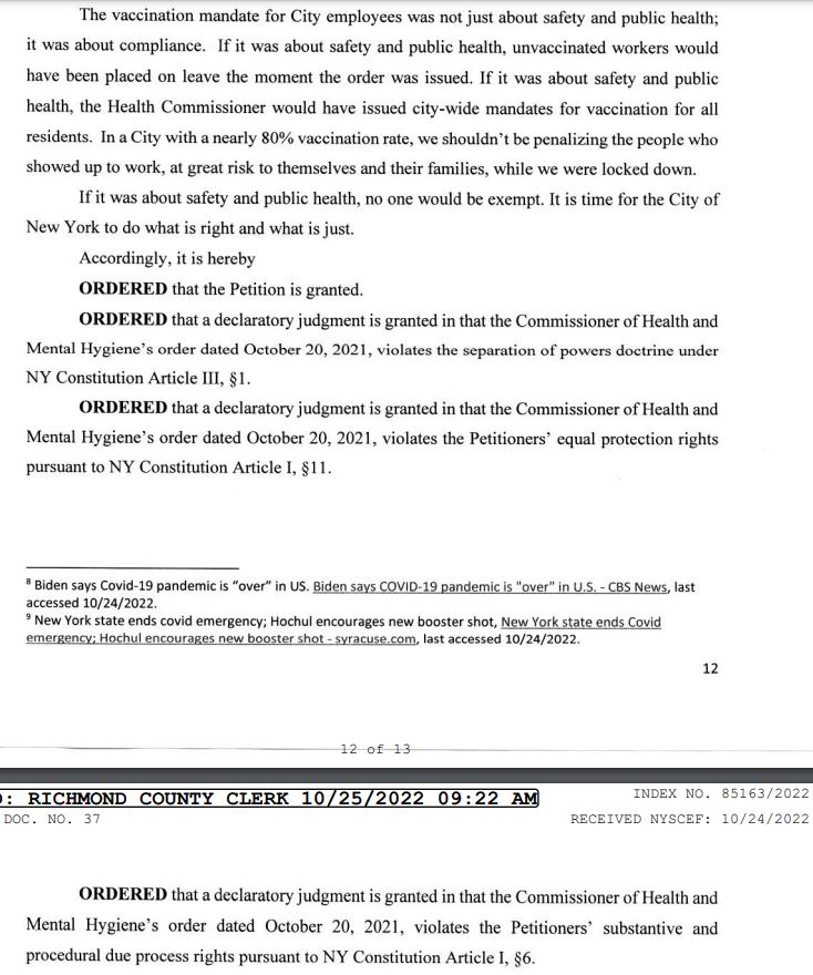 ΔΙΑΤΑΖΟΥΜΕ να εκδοθεί διαπιστωτική απόφαση, καθώς η εντολή του Επιτρόπου Υγείας και Ψυχικής Υγιεινής με ημερομηνία 20 Οκτωβρίου 2021, παραβιάζει τα ουσιαστικά και διαδικαστικά δικαιώματα των Αιτούντων, σύμφωνα με το Άρθρο I, §6 του Συντάγματος της Νέας Υόρκης. ΔΙΑΤΑΖΟΥΜΕ να εκδοθεί διαπιστωτική απόφαση διότι το Δικαστήριο διαπιστώνει ότι ο Επίτροπος δεν έχει την εξουσία και την εξουσία να αποκλείει οριστικά τους αναφέροντες από ΧΩΡΟ ΕΡΓΑΣΙΑΣ. ΔΙΑΤΑΖΟΥΜΕ ότι το Δικαστήριο κρίνει την εντολή του Επιτρόπου Υγείας και Ψυχικής Υγιεινής με ημερομηνία 20 Οκτωβρίου 2021, αυθαίρετη και ιδιότροπη σύμφωνα με τον CPLR §7803. ΔΙΑΤΑΖΟΥΜΕ ότι αυτό το Δικαστήριο κρίνει αυθαίρετο και ιδιότροπο το εκτελεστικό διάταγμα του Δημάρχου αρ. 62, σύμφωνα με το CPLR $7803. ΔΙΑΤΑΖΟΥΜΕ να απορριφθεί η αξίωση των Αιτούντων για παραβίαση της σύμβασης. ΔΙΑΤΑΖΟΥΜΕ οι απολυθέντες Αιτούντες να επαναφέρονται δια του παρόντος στην πλήρη απασχόλησή τους κατάσταση, με ισχύ στις 25 Οκτωβρίου 2022, στις 6:00 π.μ. ΔΙΑΤΑΖΟΥΜΕ ότι οι αναφέροντες δικαιούνται καθυστερημένη αμοιβή σε μισθό από την ημερομηνία καταγγελίας. (σσ καταβολή ως αναδρομικών των μισθών που στερήθηκαν με βάση την υποβολή καταγγελίας) ΔΙΑΤΑΖΟΥΜΕ ότι οι αναφέροντες να κληθούν να υποβάλουν πρόταση απόφασης σχετικά με τις καθυστερούμενες αποδοχές σύμφωνα με την παρούσα απόφαση στις 10 Νοεμβρίου 2022 ή πριν. ..