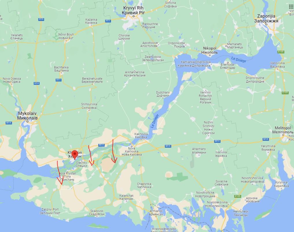 Εγκαταλείποντας τη Χερσώνα κολλήσαμε μα μεγάλη ομάδα αντίπαλων στρατιωτών σε αυτή τη κατεύθυνση.Θα εξηγήσω γιατί. Κατά την απόσυρσή δυνάμεων και μέσων μας ανατινάχθηκαν οι γέφυρες στο Δνείπερο μεταξύ ημών και του εχθρού. Υπό αυτές τις συνθήκες είναι αδύνατο γι αυτούς να επιτεθούν αλλά επίσης αυτό το συγκεντρωμένο στράτευμά τους δεν δύναται πλέον ούτε ν’ απομακρυνθεί από τη Χερσώνα,