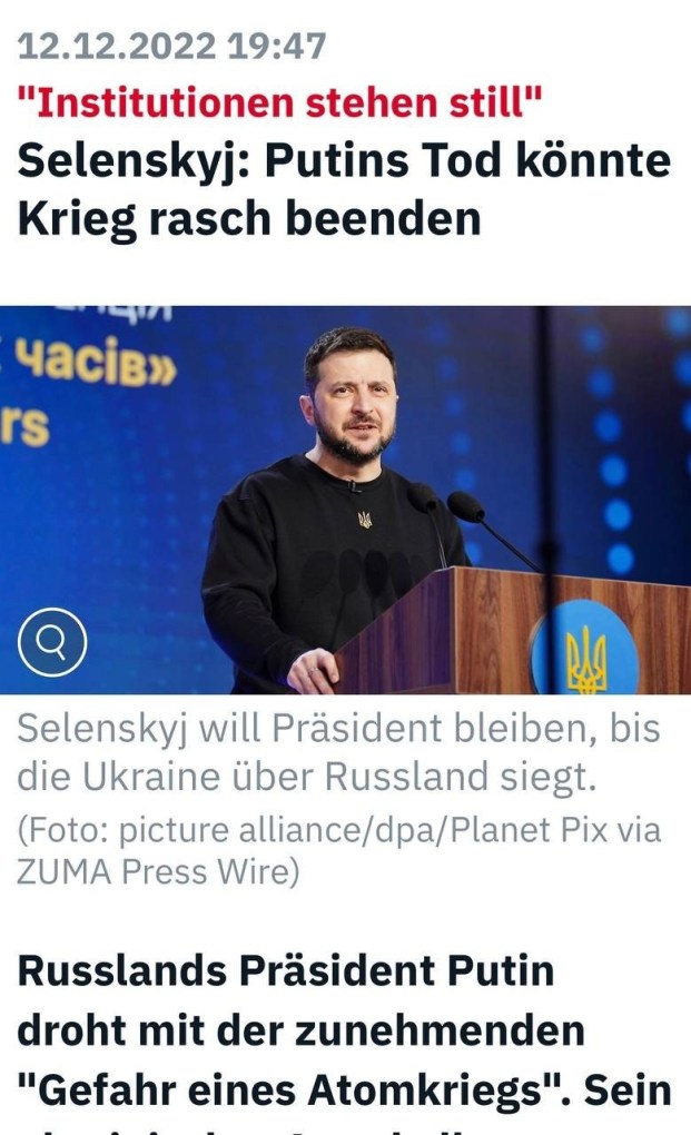 ”Σύμφωνα με άλλη μετάφραση ο Zelensky λέει ότι εισβολή στην Ουκρανία θα σταματήσει αν ο Πούτιν πεθάνει ξαφνικά”(CBKNEWS). Σε κάθε περίπτωση ο Ζελένσκι υποδεικνύει ως μόνη λύση το θάνατο του Πούτιν…Υπερέβη τα εσκαμμένα. Ουσιαστικά λέει ΣΚΟΤΩΣΤΕ ΤΟΝ ΠΟΥΤΙΝ.