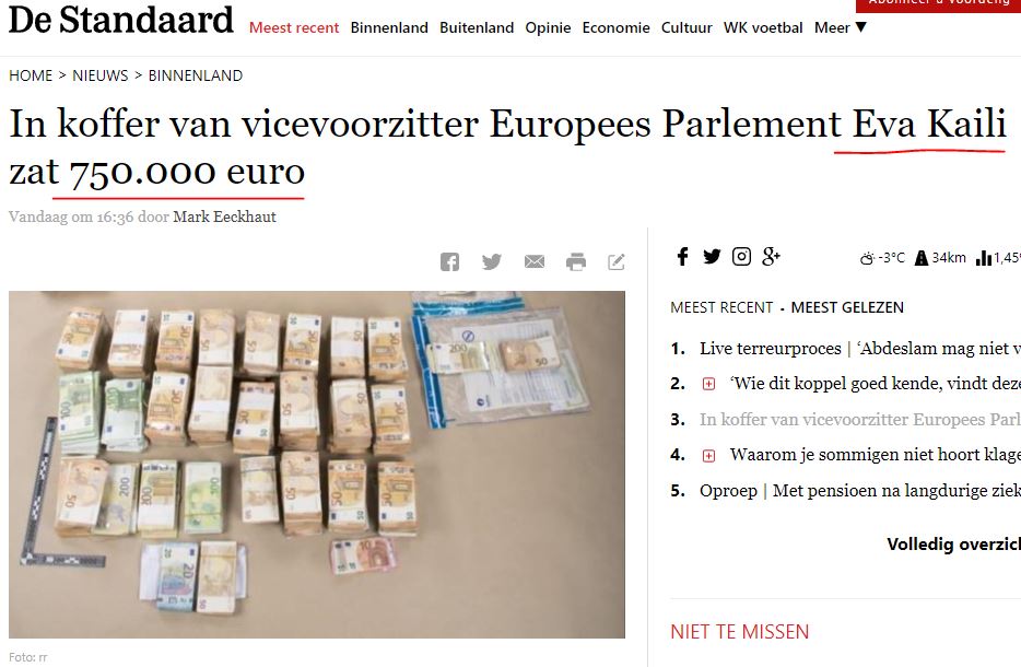 Μια βαλίτσα της αντιπροέδρου του Ευρωπαϊκού Κοινοβουλίου Εύα Καϊλή περιείχε 750.000 ευρώ. αναφέρει σε τίτλο της η βέλγικη εφημερίδα De Standaard. Πάνω από ενάμιση εκατομμύριο ευρώ κατέσχεσε συνολικά στην επιχείρηση της η ομοσπονδιακή αστυνομία. Η Καϊλή και ο σύζυγός της είχαν λοιπόν 900.000 ευρώ μετρητά όταν συνελήφθησαν γράφει η εφημερίδα. Μεγάλη ψαριά….