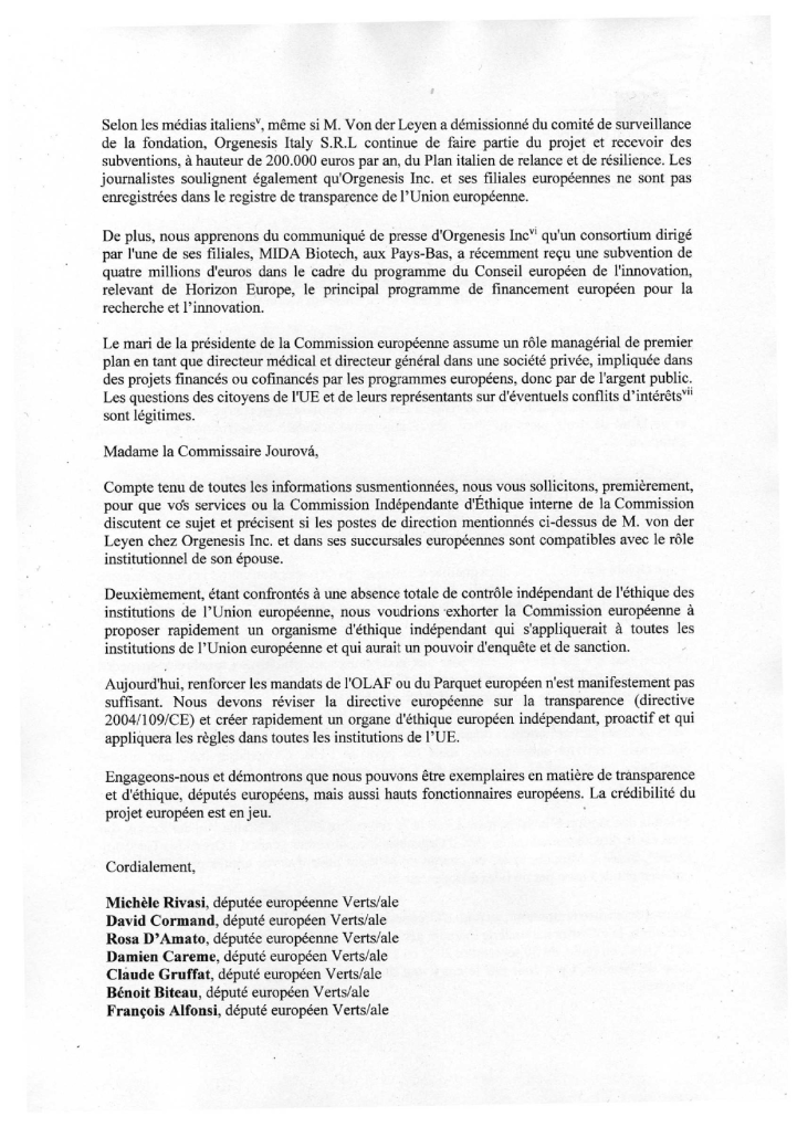 «Μας ανησυχεί ιδιαίτερα η θέαση άρθρων Τύπου στην Ιταλία και τη Γερμανία σχετικά με την εμπορική δραστηριότητα στις χώρες της ΕΕ, της Orgenesis Inc., μιας αμερικανικής εταιρείας που απασχολεί τον κ. Heiko Von Der Leyen, σύζυγο του Προέδρου της Ευρωπαϊκής Επιτροπής».