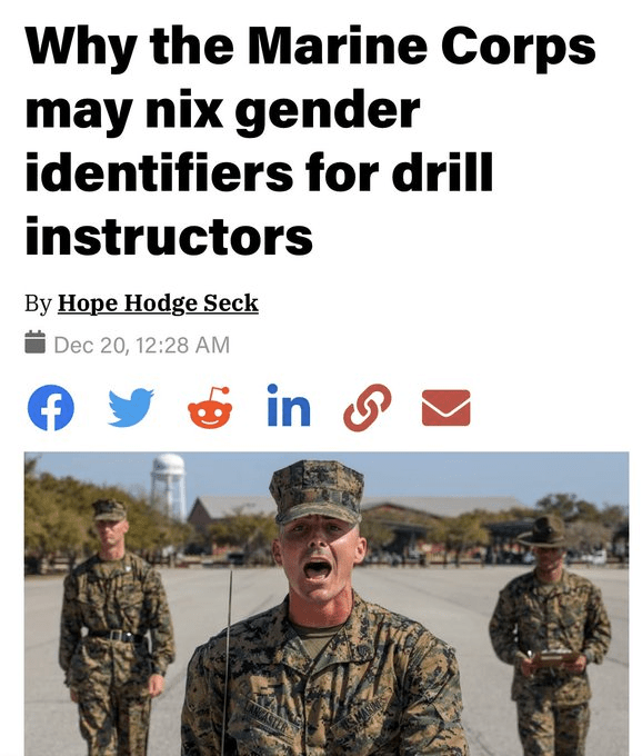 Μια πρόσφατη έκθεση που παρήγγειλε το Σώμα εγείρει «ανησυχίες» σχετικά με τους Πεζοναύτες που χρησιμοποιούν τους όρους «Κύριος» ή «Κυρία» ενώ απευθύνoνται σε εκπαιδευτές ασκήσεων λόγω ανησυχιών σχετικά με την ουδετερότητα του φύλου.