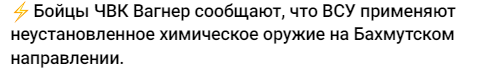 Μαχητές της PMC Wagner αναφέρουν ότι οι Ένοπλες Δυνάμεις της Ουκρανίας χρησιμοποιούν χημικά όπλα αταυτοποίητων στοιχείων στην κατεύθυνση Μπαχμούτ καθώς έπεσε το Σολεντάρ που συμπαρασύρει όλο τον άξονα από Μπαχμούτ ως Σεβέρσκ. Χάνει το Κίεβο τη μητέρα των μαχών ανοίγει ο δρόμος για την πρωτεύουσα και καταφεύγει σε ό,τι απαγορευμένο οπλισμό διαθέτει. Πανικός…Δεν χάνουν τη μάχη αλλά τον πόλεμο. Σε λίγο καιρό η Ουκρανία δεν θα υπάρχει όχι σαν χώρα αλλά ούτε καν σαν hashtag..απλά επισπεύδει το τέλος της