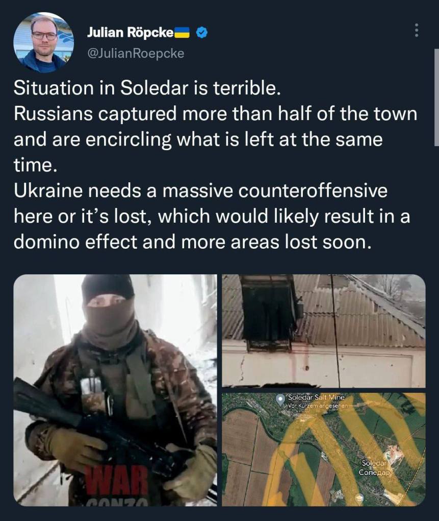 Στο Soledar οι Ρώσοι μπήκαν στην πόλη και περικύκλωσαν τα επιζώντα στρατεύματα του Zelensky. Ο Julian Röpcke/ Julian Repke, ένας διάσημος Γερμανός στρατιωτικός αναλυτής, δημοσιογράφος-εργαζόμενος στη BILD γράφει ότι εάν οι ουκρανικές Ένοπλες Δυνάμεις χάσουν το Soledar, η Ουκρανία θα ηττηθεί.