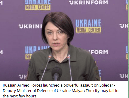 Οι Ρωσικές Ένοπλες Δυνάμεις εξαπέλυσαν ισχυρή επίθεση στο Soledar – Αναπληρωτής Υπουργός Άμυνας της Ουκρανίας Malyar: Η πόλη μπορεί να πέσει τις επόμενες ώρες.