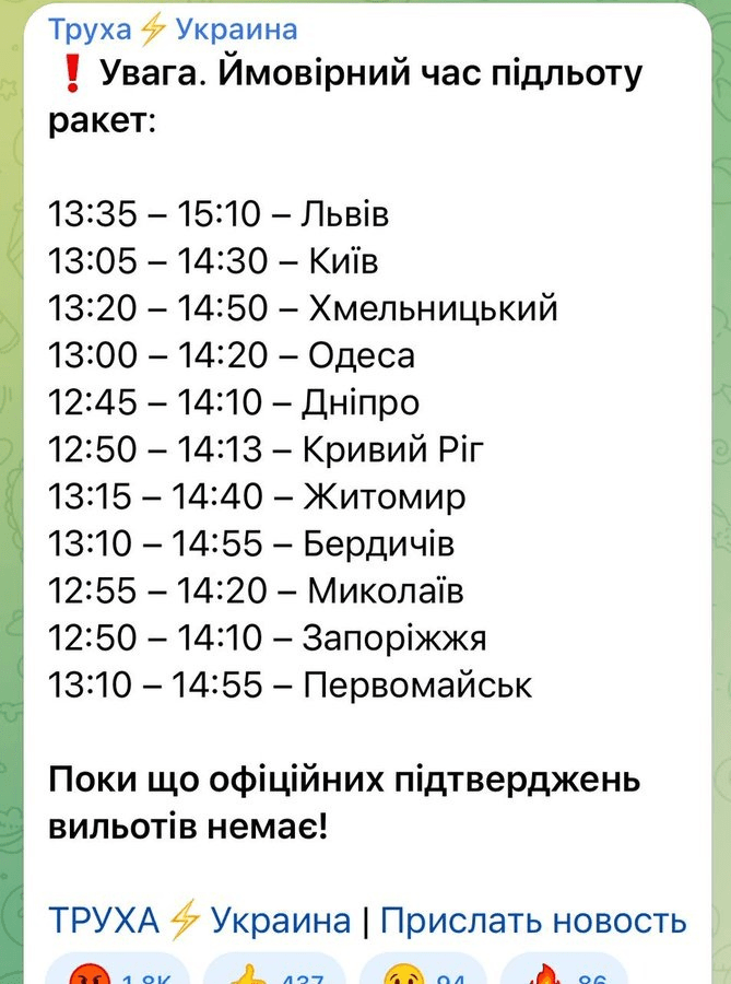 Νωρίτερα είχε αναφερθεί πως αναμένεται μεγάλης κλίμακας πυραυλική επίθεση αναμένεται στην Ουκρανία