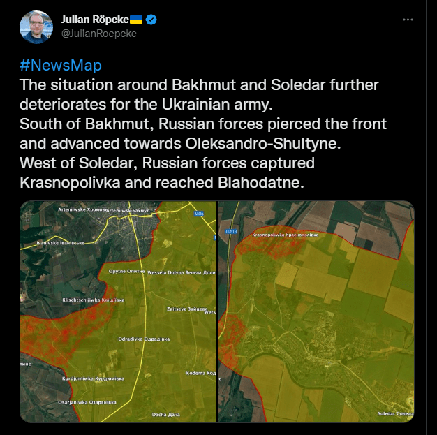 Το PMCWagner κατέλαβε την Kleshcheevka, νοτιοδυτικά του Bakhmut. και κερδίζοντας έδαφος στα βόρεια προάστια της Krasnaya Gora και καταλαμβάνει μια σειρά από θέσεις των Ενόπλων Δυνάμεων της Ουκρανίας στην περιοχή Paraskovievka και Podgorodny.