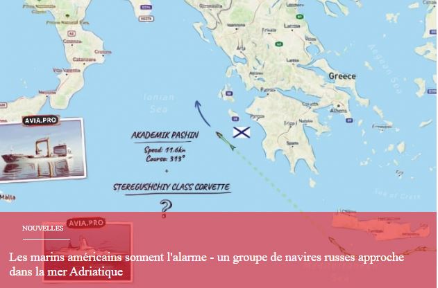 Το τάνκερ του ρωσικού Πολεμικού Ναυτικού «Akademik Pashin» με κορβέτα τύπου «Guarding» πλέει στο Ιόνιο ( σσ ανοιχτά της Πελοποννήσου ίσως εδώ να υπάρχει μια σημαντική είδηση και απάντηση σε κάποια καυτά ερωτήματα βλ χάρτη), με κατεύθυνση την Αδριατική, όπου βρίσκεται η ομάδα κρούσης του αεροπλανοφόρου «Bush».