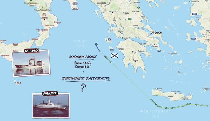 Χθες, το πλοίο ανεφοδιάστηκε με καύσιμα μια κορβέτα κλάσης Steregushchiy νότια της Κρήτης, γεγονός που μας κάνει να πιστεύουμε ότι και αυτό το πλοίο πλέει με το Akademik Pashin (όπως έκανε τον Δεκέμβριο).