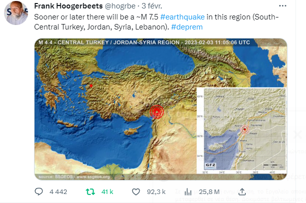 Ολλανδός ερευνητής του SSGEOS ο Frank Hoogerbeets προέβλεψε τον θηριώδη σεισμό στην Τουρκία με tweet πριν 3 μέρες. Καμιά εκκένωση πληθυσμού παραδόθηκαν στο σφαγείο!! Στις 3 Φεβρουαρίου είχε αναρτήσει στο λογαριασμό του: αργά ή γρήγορα θα υπάρξει ένα 7,5αρι σεισμός ( Νότος-Κέντρο Συρίας, Ιορδανία, Λίβανος).