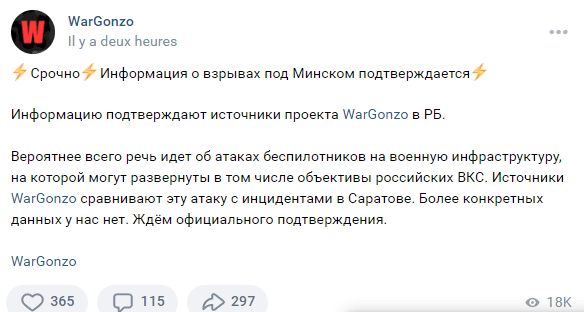Πιθανότατα, μιλάμε για επιθέσεις drones σε στρατιωτικές υποδομές, στις οποίες μπορούν να αναπτυχθούν ρωσικά AWACS. Οι πηγές του Wargonzo συγκρίνουν αυτή την επίθεση με τα επεισόδια στο Σαράτοφ. Δεν έχουμε πιο συγκεκριμένα στοιχεία. Αναμένουμε επίσημη επιβεβαίωση.Xτυπήθηκε αεροδρόμιο στα 12χλμ από Μινσκ..