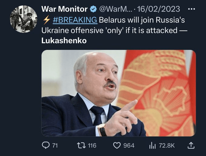 όλα αυτά συμπίπτουν με προωθημένες κινήσεις Λουκατσένκο όπως την επίσκεψη του στην Κίνα…την ένταση στην Υπερδνειστερία κλπ Ενδιαφέρουσα δήλωση εδώ αυτή του Λουκατσένκο ότι θα μπει η χώρα του στον πόλεμο στο πλευρό Ρωσίας μόνο στην περίπτωση που θα δεχθεί επίθεση…..