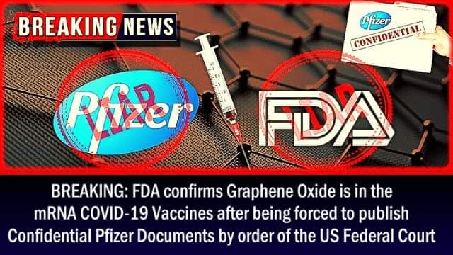 Επειδή έχουν προκύψει πρόσφατα στοιχεία που επιβεβαιώνουν την παρουσία οξειδίου του γραφενίου, μιας εξαιρετικά τοξικής και καθαρής ουσίας, στο εμβόλιο της Pfizer. Και προέρχεται από τον Οργανισμό Τροφίμων και Φαρμάκων των ΗΠΑ (FDA), ο οποίος αναγκάστηκε να δημοσιοποιήσει εμπιστευτικά έγγραφα της Pfizer με εντολή του Ομοσπονδιακού Δικαστηρίου