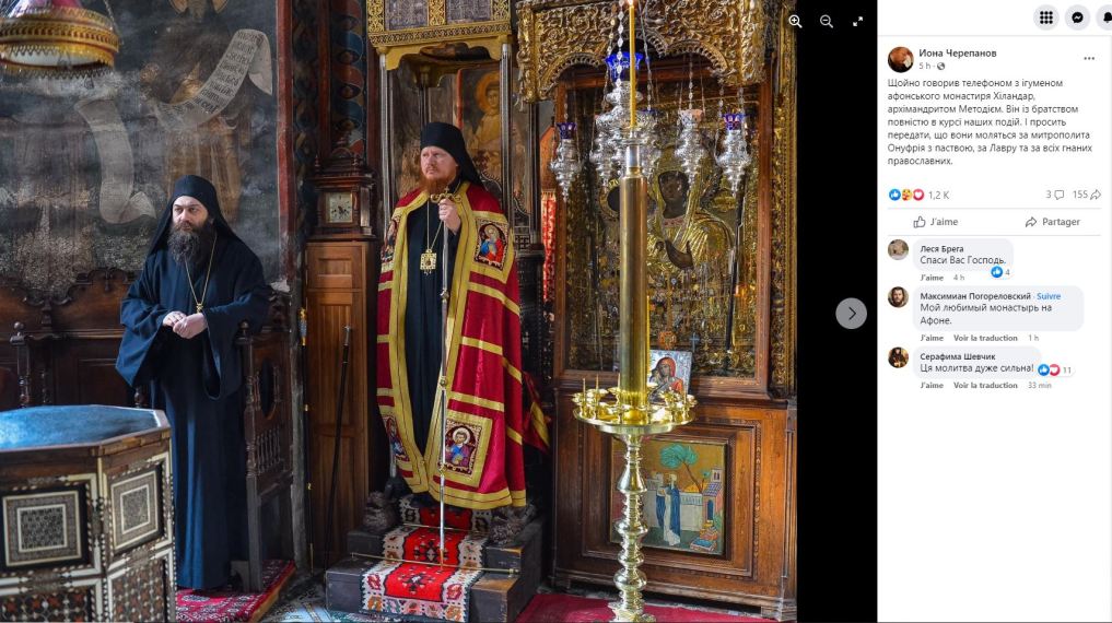 ”Μόλις μίλησα στο τηλέφωνο με τον ηγούμενο της μονής Χιλανδαρίου του Άθω, Αρχιμανδρίτη Μεθόδιο. Αυτός και η αδελφότητα έχουν πλήρη επίγνωση των γεγονότων μας. Και ζητά να μεταδώσει ότι προσεύχονται για τον Μητροπολίτη Ονούφριο και το ποίμνιό του, για τη Λαύρα και για όλους τους κατατρεγμένους Ορθοδόξους.”