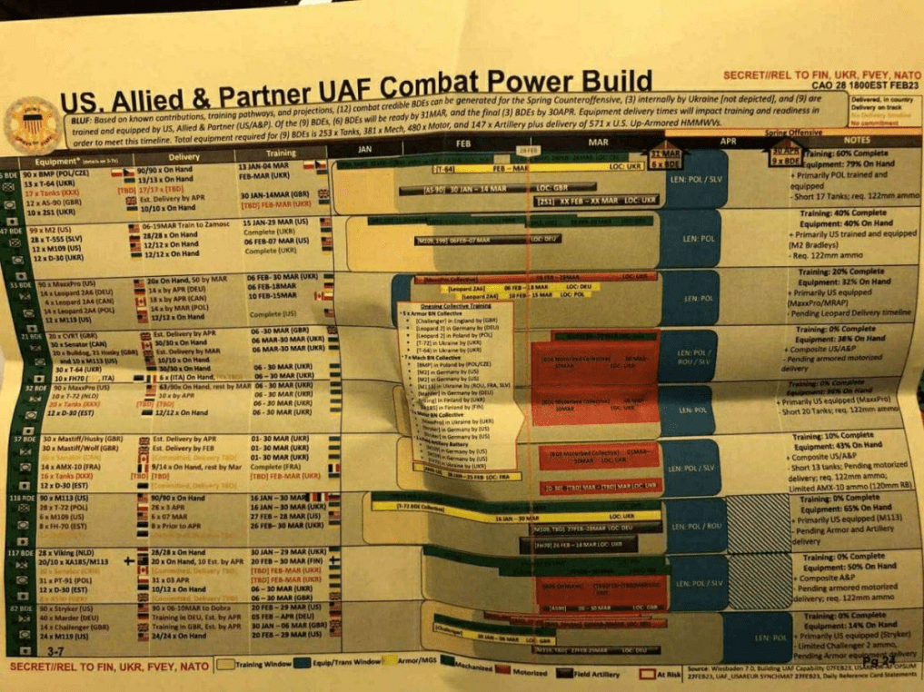 Τα έγγραφα κυμαίνονται από λεπτομέρειες της συνεχιζόμενης μάχης στο Μπαχμούτ μέχρι σχέδια για μια αντεπίθεση ΝΑΤΟ-Ουκρανίας που σύμφωνα με πληροφορίες είναι προγραμματισμένη για αυτή την άνοιξη, με τη συμμετοχή 14 γαλλικών AMX10. Η διαρροή φαίνεται να προέρχεται από τον Γενικό Επιτελείο του Πενταγώνου.