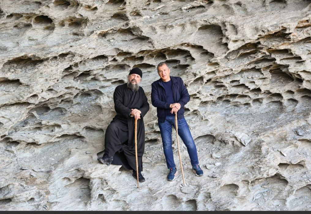 Ο πατέρας Αέτιος σκαρφαλώνει παρουσιάζει τις σπηλιές του Γερακώνα, εκεί που ασκήτευαν μοναχοί μέχρι την δεκαετία του ’40 και σήμερα είναι κατοικημένες από γεράκια που αναπτύσσουν ταχύτατες και 360-390 χλμ την ώρα.