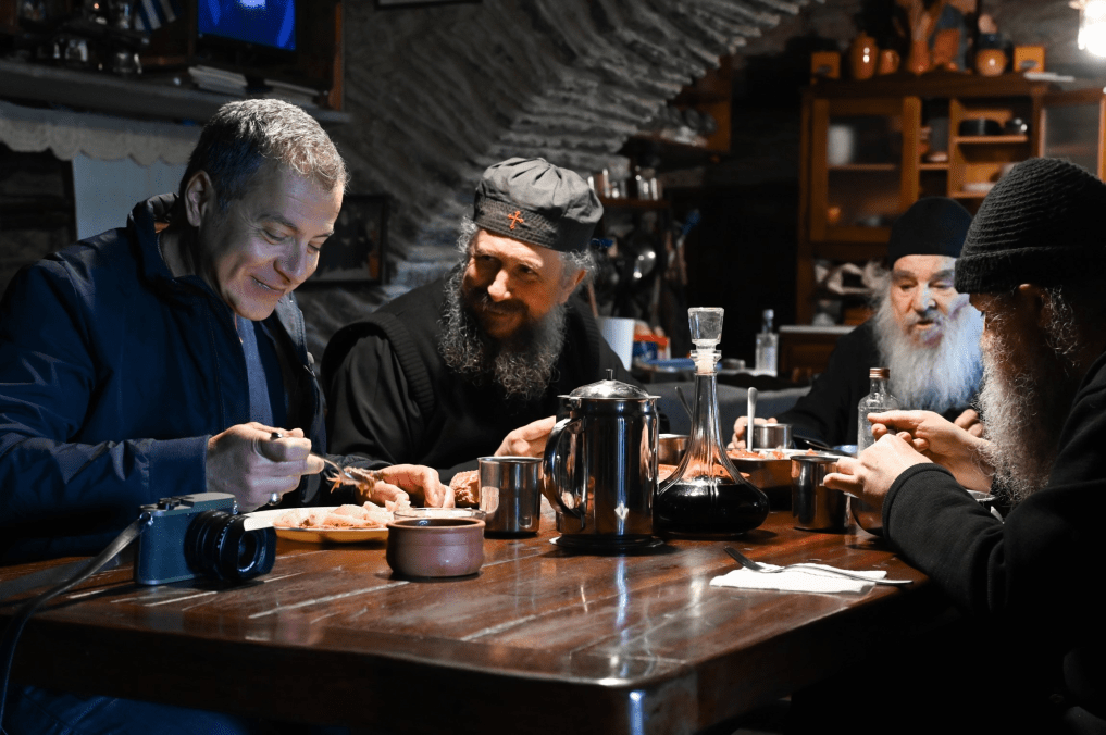 Διηγείται ο μοναχός ότι ο εκκεντρικός καλλιτέχνης είχε ένα σπίτι στην Άνδρο και Πάσχα έκανε μαζί τους στη μονή. Καθόταν σούζα στην ακολουθία και πολύ σοβαρός με συναίσθηση και είπε ότι η τέχνη και η ελευθερία της έκφρασης είναι δεδομένη κι ακόμη και όταν είναι ακραία έχει να περάσει ένα μήνυμα. Η μονή είναι γνωστή και ως ”η μονή των μουσικών” γιατί προφανώς κάποιοι από τη συνοδεία του Γέροντα είχαν πολύ καλή σχέση μαζί της στην κοσμική τους ζωή κάποιος μάλιστα στην εκπομπή ειπώθηκε ότι ήταν ντράμερ.