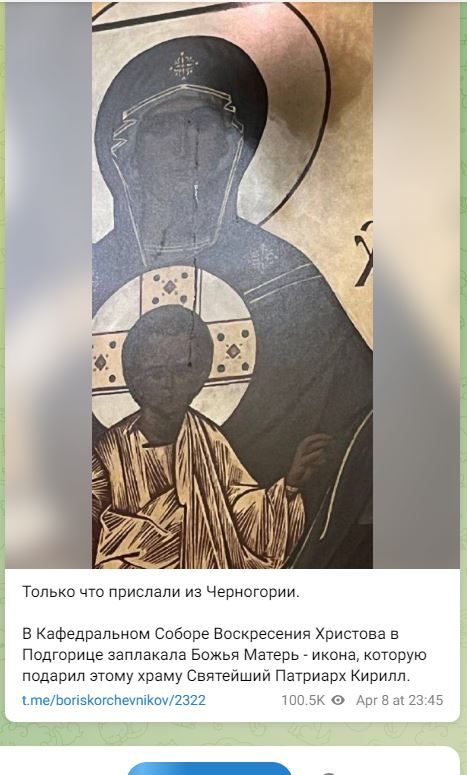 Στον Καθεδρικό Ναό της Αναστάσεως του Χριστού στην Ποντγκόριτσα, η Παναγία δακρύζει – μια εικόνα που ο Παναγιώτατος Πατριάρχης Κύριλλος πρόσφερε σε αυτόν τον ναό.”