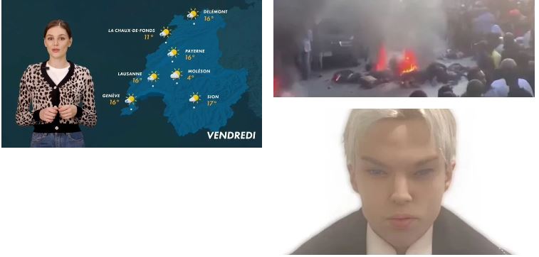 Στο ελβετικό κανάλι M Le Média, η Jade, μια παρουσιάστρια του καιρού δημιουργήθηκε από τεχνητή νοημοσύνη. Η εμφάνιση και η φωνή της παραμένουν πολύ ρεαλιστικά. Η εποχή των παρουσιαστών σε μορφή avatar μπορεί μόλις να ξεκίνησε. Από τις 3 Απριλίου, κάθε πρωί ο Jade παρουσιάζει την πρόγνωση του καιρού σε αυτό το ολοκαίνουργιο γαλλόφωνο ελβετικό κανάλι. Ο τόνος, η φωνή εκπλήσσουν. Το σταθερό βλέμμα, οι χειρονομίες, λίγο σπασμωδικές και η έλλειψη χιούμορ αποκαλύπτουν μια ψυχρή, τεχνητή νοημοσύνη.