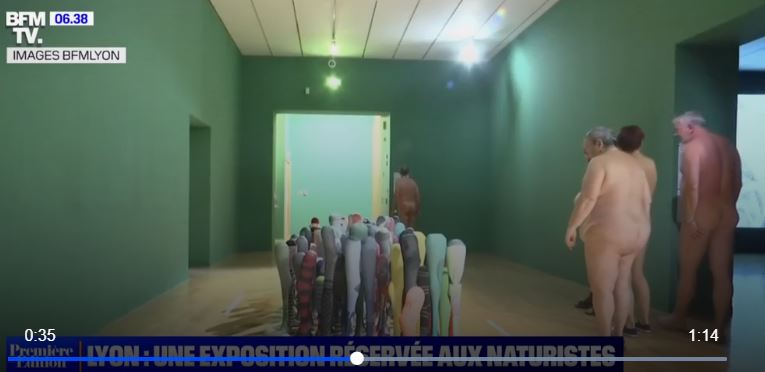 Γυμνοί επισκέπτες περιηγούνται στο μουσείο σύγχρονης τέχνης στη Λυών, σε μια έκθεση για το ανθρώπινο σώμα εντελώς γυμνοί τη βραδιά της Πέμπτης. (BFMTV) ”Μια επιθυμία για ελαφρότητα” σχολιάζουν οι συμμετέχοντες.. προφανώς για τη ”Χαμένη ελαφρότητα του είναι”..