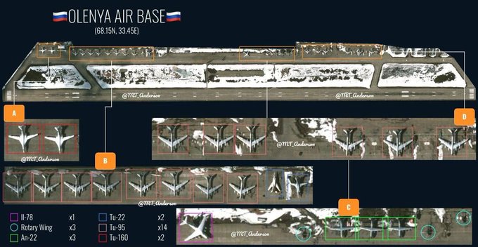 Πρόσφατες αναφορές δείχνουν επίσης ότι τα στρατηγικά βομβαρδιστικά που πετούν έξω από την αεροπορική βάση Olenya συμμετέχουν σε επιθέσεις με πυραύλους κρουζ στην Ουκρανία.
