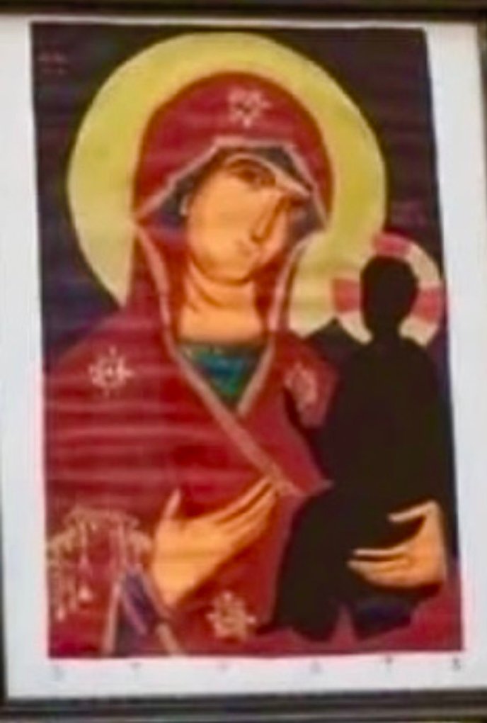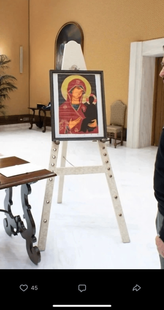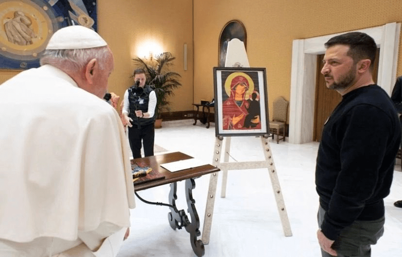 Ο Ζελένσκι πρόσφερε στον Πάπα μια εικόνα της Παναγίας Βρεφοκρατούσας που φιλοτεχνήθηκε από υπολείμματα ενός αλεξίσφαιρου γιλέκου. Μιλιταριστικός χριστιανισμός..Ο Χριστός είναι κατάμαυρος σκουτεινός πίσσα σκοτάδι το Φως του κόσμου ο Ζελένσκι το απέδωσε ως Σκότος ζοφερό. Τι λένε οι Ορθοδοξάρες Φωστήρες και το Φανάρι που τον υποστηρίζουν; Σκοταδισμός σατανισμός ……θρησκευτικός αναλφαβητισμός κλπ