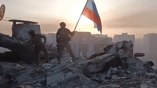 Ο Πριγκόζιν εμφανίζεται σε ένα βίντεο που δημοσιεύτηκε στο Telegram με τους μαχητές του πίσω του κρατώντας τη ρωσική σημαία ενώ περιβάλλεται από ερείπια του Μπαχμούτ.