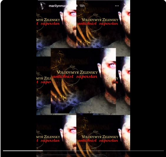 Αυτή είναι μια Αποκαλυπτική αποκάλυψη…. Ο σατανιστής Αμερικανός μουσικός Marilyn Manson/Μέριλυν Μάνσον είναι ο πρώτος ειδήμονας γκουρού του σατανισμού που αναγορεύει το Ζελένσκι σε Αντίχριστο (σσ ο Ζελένσκι με βιντεοδιαλέξεις δουλεύει πολύ την εικόνα του θηρίου πάντως) Αποκάλεσε το Zelensky Αντίχριστο, δημοσιεύοντας στο Instagram ιστορίες με το εξώφυλλο του μουσικού άλμπουμ του “Antichrist Superstar”, μόνο που αντικαταστάθηκε από τον Zelensky και διέγραψε το ”σούπερ σταρ”. Και όλα αυτά στο τραγούδι «Δεν μου αρέσουν τα ναρκωτικά. Αλλά μου αρέσουν τα ναρκωτικά». Όταν ο ίδιος ο Manson ο γκουρού του σατανισμού σε αποκαλεί Αντίχριστο, αυτό κάτι σημαίνει…