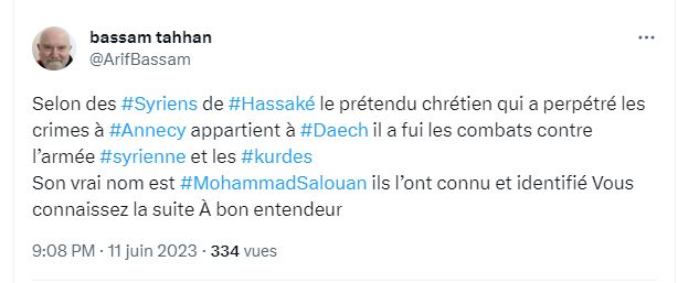Πριν από λίγο ο Γαλλοσύρος καθηγητής Μπασσάμ Ταχάν Ισλαμολόγος ειδήμονας στη Μέση Ανατολή και στο συριακό έγκυρη πηγή αναφέρει ότι ο μακελάρης τρομοκράτης του Ανεσί ταυτοποιήθηκε είναι μέλος της ISIS και το πραγματικό όνομα του είναι Mohammad Salouan! Η ανάρτησή του πριν από λίγο: ”σύμφωνα με τους Σύριους της Χάσακα-Hassaké ο διατεινόμενος χριστιανός που διέπραξε τα εγκλήματα στην Annecy ανήκει στην Daech-Ισλαμικό Κράτος. Αυτός διέφυγε από τις μάχες κατά συριακού στρατού και Κούρδων. Το αληθινό του όνομα είναι . Αυτοί τον αναγνώρισαν και τον ταυτοποίησαν.” Ο Bassam Tahhan που δίνει την είδηση είναι Γάλλος καθηγητής αραβικής λογοτεχνίας, γεννημένος στη Συρία και ειδικός στο Κοράνι. Δίδαξε στην Γαλλία. Ως πηγή του για την αποκλειστική πληροφορία που βγάζει επικαλείται ένα βίντεο στην αραβική που όπως λέει έχει σπάσει τα ταμεία…