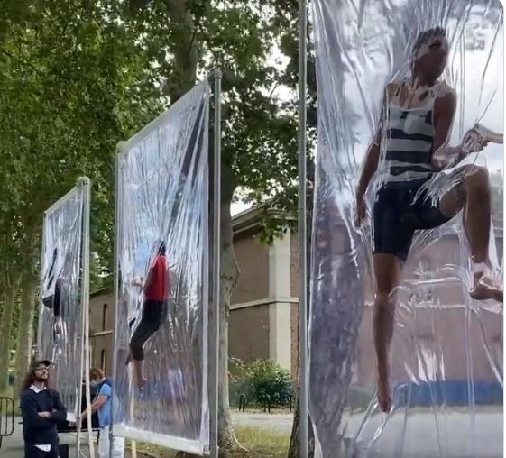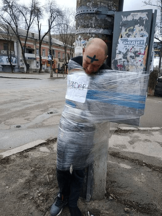 O Ζελένσκι ως καλλιτέχνης που είναι, προφανώς εμπνεύστηκε……….. από τον Lawrence Malstaf για να δέσει σε στύλους ανθρώπους ακινητοποιημένους με πλαστικό. Βασανιστήρια ως performance art.Μόνο που στο ζωντανό έργο του Lawrence Malstaf συμμετέχουν εθελοντές ενώ στο άλλο είναι αιχμάλωτοι πολίτες που τους βάζει ο Ζελένσκι να κολλούν σαν κουνούπι πάνω σε ζώνες με κόλα…