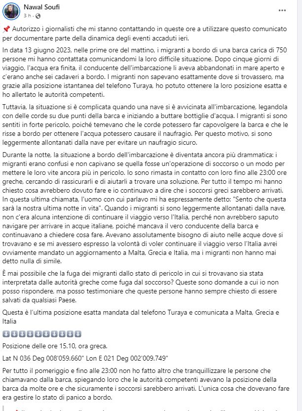 Εξουσιοδοτώ τους δημοσιογράφους που επικοινωνούν μαζί μου αυτές τις ώρες να χρησιμοποιήσουν αυτήν την έκδοση για να τεκμηριώσουν μέρος της δυναμικής των χθεσινών γεγονότων. Στις 13 Ιουνίου 2023, τα ξημερώματα, επικοινώνησαν μαζί μου μετανάστες που επέβαιναν σε μια βάρκα φορτωμένη με 750 άτομα και μου είπαν για τη δύσκολη κατάστασή τους. Μετά από πέντε ημέρες ταξιδιού, τα νερά είχαν τελειώσει, ο οδηγός του σκάφους τους είχε εγκαταλείψει στην ανοιχτή θάλασσα και στο πλοίο υπήρχαν επίσης έξι νεκροί. Οι μετανάστες δεν ήξεραν ακριβώς πού βρίσκονταν, αλλά χάρη στην άμεση τοποθεσία του τηλεφώνου Turaya, μπόρεσα να βρω την ακριβή τοποθεσία τους και ειδοποίησα τις αρμόδιες αρχές. Ωστόσο, η κατάσταση έγινε πιο περίπλοκη όταν ένα πλοίο πλησίασε το σκάφος, το έδεσε με σχοινιά σε δύο σημεία του σκάφους και άρχισε να πετάει μπουκάλια με νερό. Οι μετανάστες ένιωσαν μεγάλο κίνδυνο, καθώς φοβήθηκαν ότι τα σχοινιά θα μπορούσαν να ανατρέψουν το σκάφος και ότι οι μάχες επί του σκάφους για να πάρουν νερό θα μπορούσαν να οδηγήσουν σε ναυάγιο. Εξαιτίας αυτού, απομακρύνθηκαν ελαφρώς από το σκάφος για να αποφύγουν ένα ασφαλές ναυάγιο.