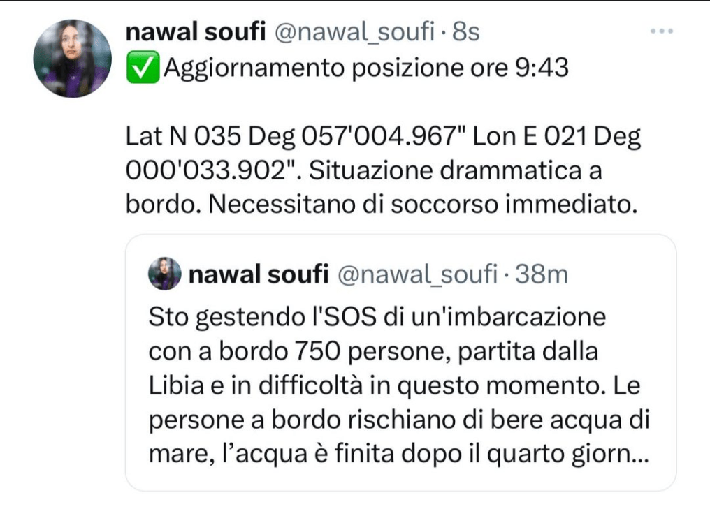 Ζητάμε άμεση βοήθεια από την Ελλάδα ή τη Μάλτα. Προσπαθώ να συνεχίσω να διαχειρίζομαι την κατάσταση του πανικού στο πλοίο, καθιστώντας σαφές ότι δεν θα αφεθούν στη μοίρα τους και ότι σίγουρα θα φτάσουν και άλλα πλοία για να ολοκληρώσουν τη διάσωση.