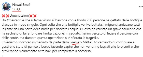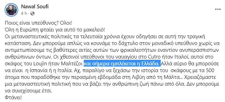 Η Νawal Soufi μαροκινής καταγωγής μεγάλωσε στη Σικελία, βραβευμένη από την Ευρωπαϊκή Ένωση για τον ακτιβισμό της στο προσφυγικό είχε το προνόμιο της επικοινωνίας με το αλιευτικό του θανάτου περισσότερο κι από τις αρχές. Τους καθοδηγούσε, τους διαχειριζόταν ώσπου πνίγηκαν.. Εκπέμπει από Ιταλία και διαθέτει ιταλική υπηκοότητα. Είναι η γυναίκα που είχε επαφή με τους πρόσφυγες που βυθίστηκαν …και που αυτή πρώτη ειδοποίησε τις αρχές. Καλό άλλοθι. Είχε και αυτή εμπλακεί σε αυτό το ανθρωπιστικό έγκλημα; Το τόξο είναι ΕΕ/ΜΚΟ Τουρκία-συριακή αντιπολίτευση.. Παλιά έλεγαν οι εφοπλιστές πνίγουν τα καράβια τώρα οι ΜΚΟ οι ευρωεπιδοτούμενες πνίγουν τα καράβια; Bραβευμένη και το 2017 στο Ντουμπάι όταν ο αραβικός κόσμος ήταν εναντίον του Άσαντ. αναφέρεται ως ”άγγελος των προσφύγων”