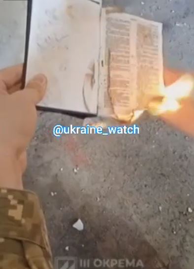 Ένας Ουκρανός στρατιώτης καίει μια Βίβλο γιατί ήταν γραμμένη στη ρώσικη γλώσσα. Αντίχριστοι κανονικοί..διεξάγουν θρησκευτικό πόλεμο. Αρχίζει να καίει τη Βίβλο με το που λέει ”Slava Ukraini-Δόξα στην Ουκρανία”.Αυτά τα όπλα ευλόγησε ο ηγούμενος της Ξενοφώντος;