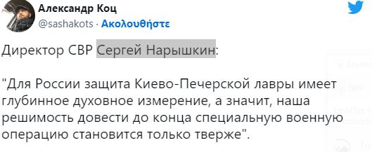 O Διευθυντής της ρώσικης αντικατασκοπείας Σεργκέι Ναρίσκιν: «Για τη Ρωσία, η άμυνα της Λαύρας Κιέβου-Πετσέρσκ (Σπηλαίων) έχει μια βαθιά πνευματική διάσταση, πράγμα που σημαίνει ότι η αποφασιστικότητά μας να ολοκληρώσουμε την ειδική στρατιωτική επιχείρηση γίνεται όλο και πιο ισχυρή».