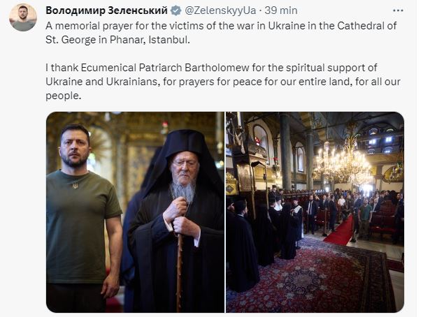 Eλλληνικά εκκλησιαστικά sites επιχειρούν να καλύψουν Βαρθολομαίο γράφοντας ότι ο Ζελένσκι απλώς ξεναγήθηκε στον Πατριαρχικό Ναό του Αγίου Γεωργίου. Τους διαψεύδει ο ίδιος Ζελένσκι γράφοντας ότι παραβρέθηκε σε ”Επιμνημόσυνη δέηση για τα θύματα του πολέμου στην Ουκρανία στον καθεδρικό ναό του Αγίου Γεωργίου στο Φανάρι της Κωνσταντινούπολης.”