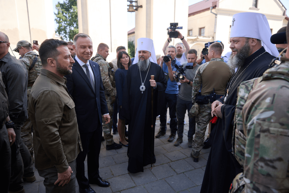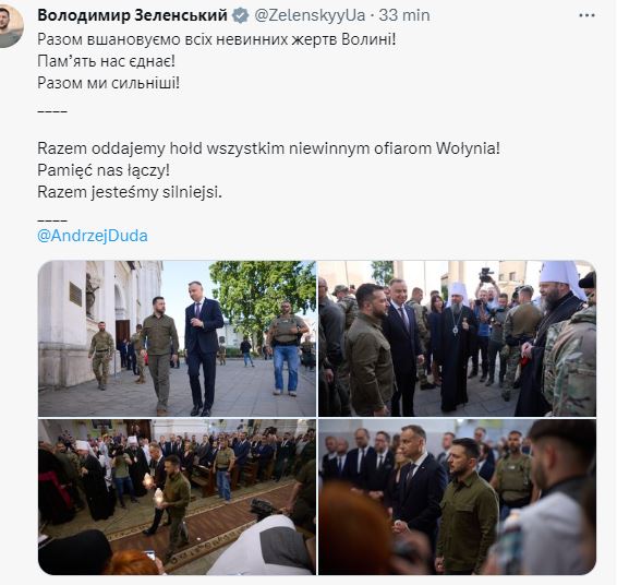 Όπως ανέφεραν τα μέσα μαζικής ενημέρωσης, οι πρόεδροι παρακολούθησαν θεία λειτουργία – αυτήν την ημέρα στο Λούτσκ τιμάται η μνήμη των θυμάτων του Β’ Παγκοσμίου Πολέμου και της τραγωδίας του Βολίν.