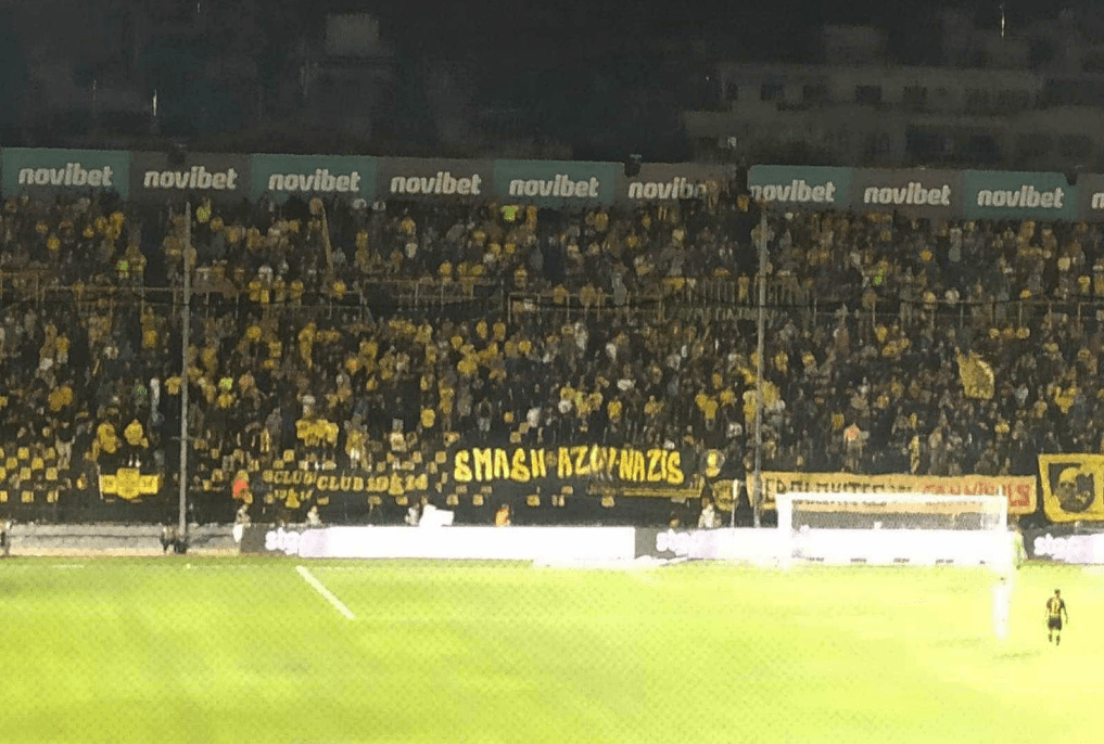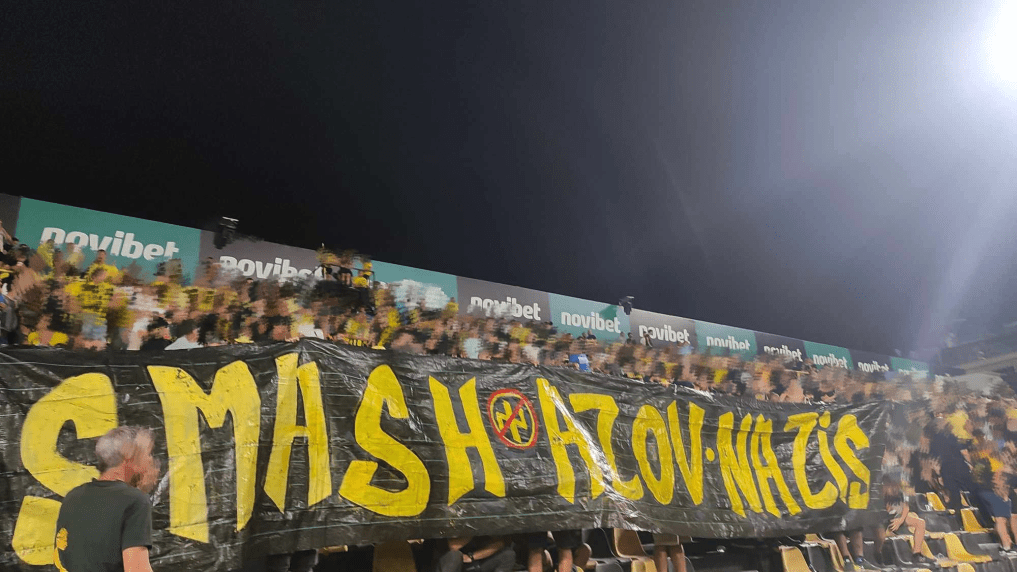 Πανό από τους οπαδούς του Άρη στο σημερινό ματς με την Ντιναμό Κιέβου απέναντι στα ναζιστικά τάγματα εφόδου των AZOV του φασιστικού καθεστώτος του Κιέβου που προσκύνησε η Ελληνική Βουλή…