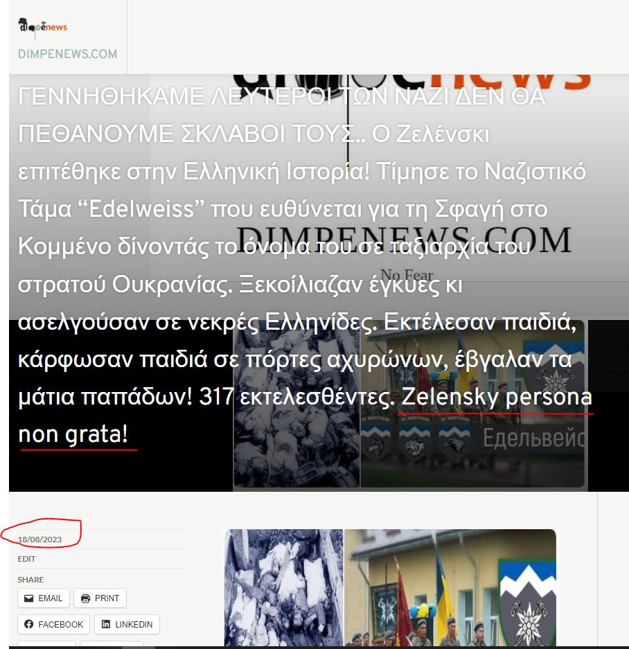 Μυστική διπλωματία φέρνουν το Ζελένσκι νύχτα από την πίσω πόρτα πισώπλατα του ελληνικού λαού. Κάτι ήξερε το dimpenews.com και είχε τίτλο στις 18/8/23 Zelensky persona non grata! πριν υπάρξει διεθνώς η παραμικρή αναφορά για κάθοδο του Ζελένσκι σ΄Αθήνα. Είναι αυτός που τίμησε τους ναζήδες που πετσόκοψαν το ΚΟΜΜΈΝΟ.