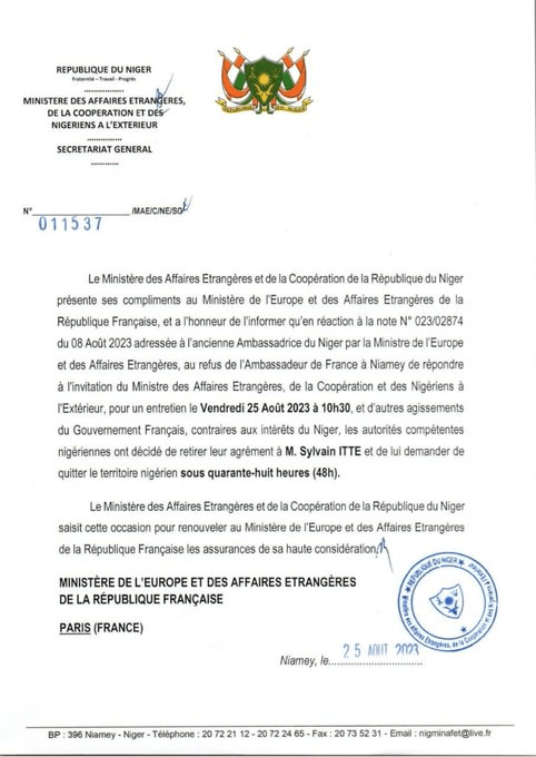 Ο Γάλλος πρεσβευτής στο Νιαμέι στη Νιγηρία ανακηρύσσεται «persona non grata» και οι αρχές του Νίγηρα ζητούν από τον Γάλλο πρεσβευτή να φύγει από τον Νίγηρα εντός 48 ωρών. Απο-αποικιοποίηση τώρα.