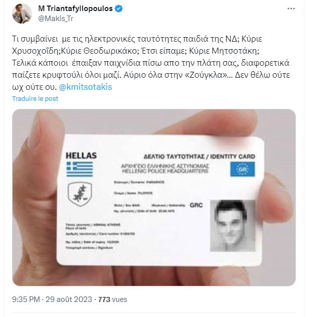”Τι συμβαίνει με τις ηλεκτρονικές ταυτότητες παιδιά της ΝΔ; Κύριε Χρυσοχοΐδη;Κύριε Θεοδωρικάκο; Έτσι είπαμε; Κύριε Μητσοτάκη; Τελικά κάποιοι έπαιξαν παιχνίδια πίσω απο την πλάτη σας, διαφορετικά παίζετε κρυφτούλι όλοι μαζί. Αύριο όλα στην «Ζούγκλα»… Δεν θέλω ούτε ωχ ούτε ου @kmitsotakis”