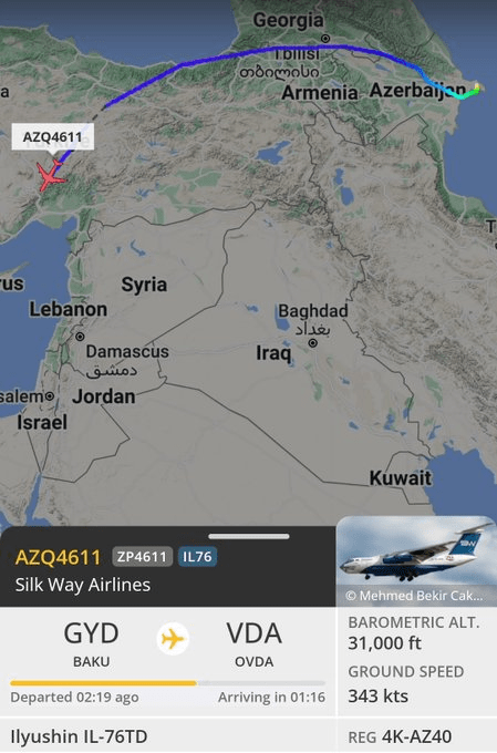 Επίσης τις τελευταίες ημέρες πραγματοποιούνται πολύ τακτικές πτήσεις μεταγωγικών αεροπλάνων μεταξύ Τουρκίας και Αζερμπαϊτζάν και Ισραήλ και Αζερμπαϊτζάν. Ανάλογες στρατιωτικές κινήσεις ακόμη παρατηρούνται και από το Αζερμπαϊτζάν.Πτήσεις cargo του Αζερμπαϊτζάν κατευθύνονται προς Ισραήλ από Τουρκία.. Φαίνεται ότι Τουρκία, Ισραήλ εντείνουν τις παραδόσεις όπλων στο Αζερμπαϊτζάν αφού για Τουρκία είναι 1 λαός 2 έθνη και για Ισραήλ είναι βασικός σύμμαχος έναντι Ιράν.