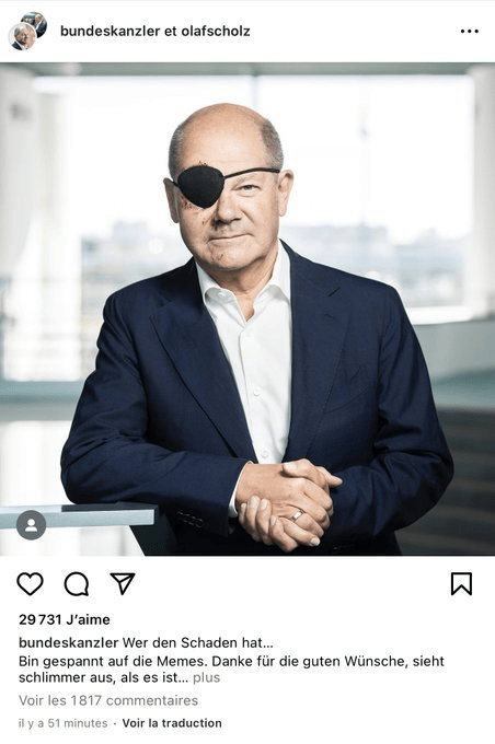 Ο Γερμανός Καγκελάριος Όλαφ Σολτς μετά από πτώση φέρει ένα πειρατικό επίθεμα στο μάτι ως άβαταρ του Μοσέ Νταγιάν! Όταν η ζωή κάνει παιχνίδια για να μας ανοίξει τα μάτια…Θύμα βίαιης πτώσης κατά τη διάρκεια του τζόκινγκ του αυτό το Σαββατοκύριακο, ο Γερμανός καγκελάριος Όλαφ Σολτς φοράει ένα επίθεμα ματιών στο Instagram χθες το πρωί.