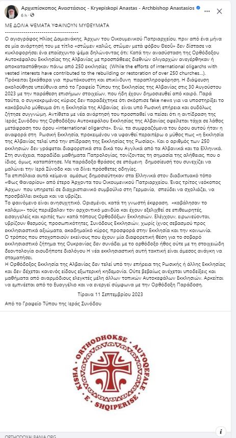 Όλα αυτά αναφέρονται σε σημερινό δελτίο τύπου που εξέδωσε το Γραφείο Τύπου της Ιεράς Συνόδου της Αυτοκέφαλης Ορθόδοξης Εκκλησίας Αλβανίας και αναδημοσιεύεται στην επίσημη σελίδα στο fb του Αρχιεπισκόπου Αναστάσιου: