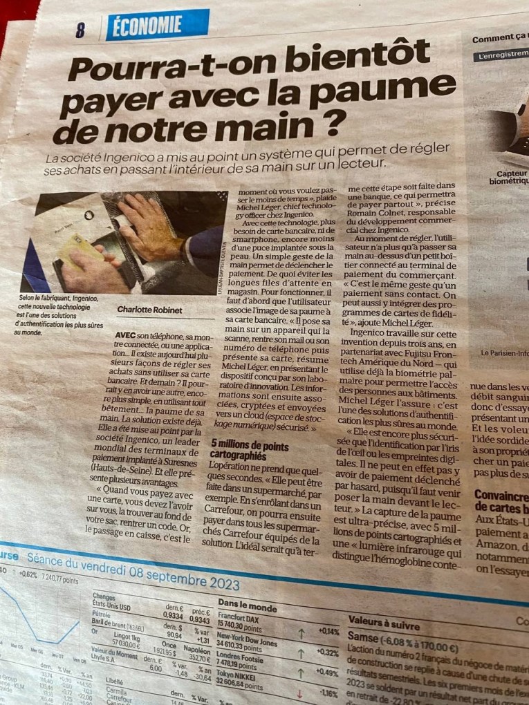 Θεωρείται ότι είναι μια από τις πιο ασφαλείς συναλλαγές ακόμη κι από την ιριδοσκόπηση. Το σκανάρισμα της παλάμης είναι υπερακριβείας με 5.000.000 σημεία χαρτογραφημένα και με μια υπέρυθρη ακτινοβολία που διακρίνει την αιμοσφαιρίνη”. γαλλικός τύπος 8/9/23