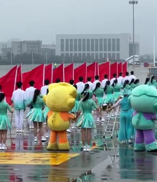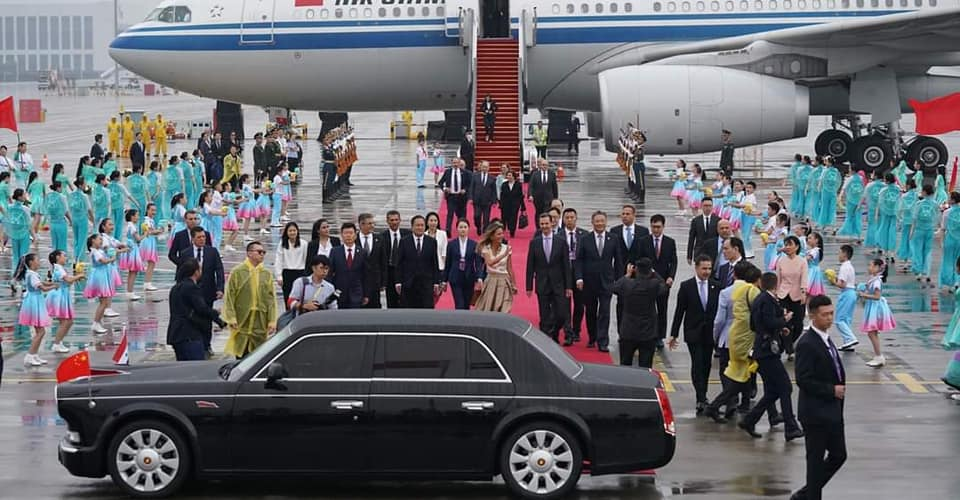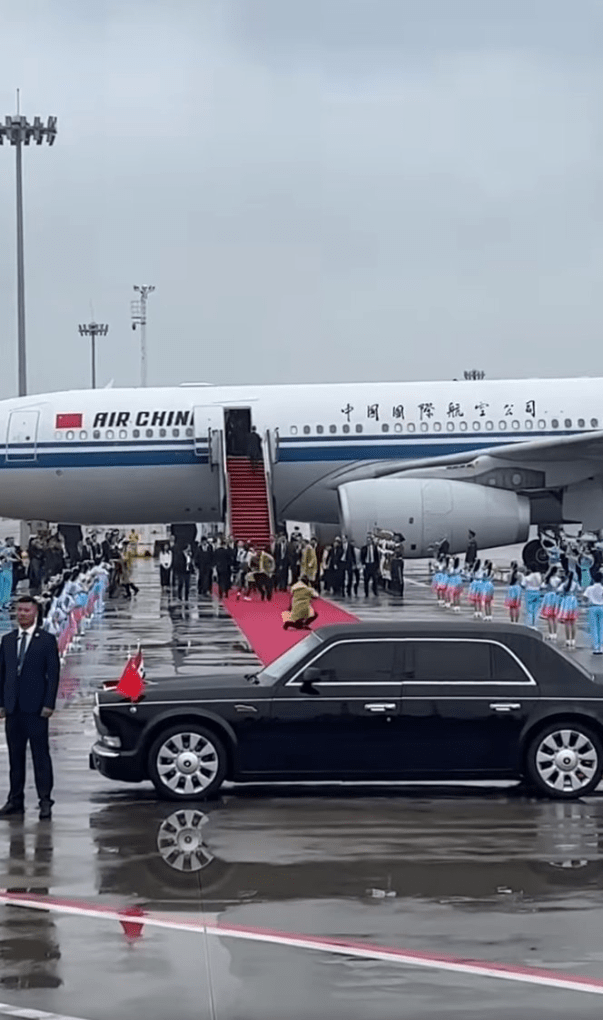 Και στις δύο άκρες του κόκκινου χαλιού παρατάχθηκε η τιμητική φρουρά και πίσω τους μια μεγάλη ομάδα παιδιών από την Κίνα που κρατούσαν σημαίες και τραγουδούσαν κινέζικα εθνικά και παραδοσιακά τραγούδια. Δύο παιδιά έδωσαν επίσης ανθοδέσμες στον Πρόεδρο και την Πρώτη Κυρία.
