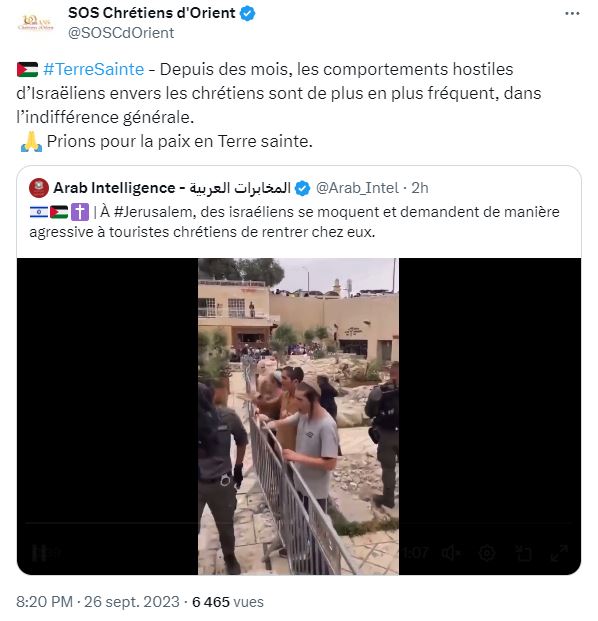 ”Εδώ και μήνες οι αντίπαλες και επιθετικές συμπεριφορές των Ισραηλινών είναι όλο και πιο συχνές μέσα στη γενική αδιαφορία..” σχολιάζει η οργάνωση SOS Chrétiens d’Orient.
